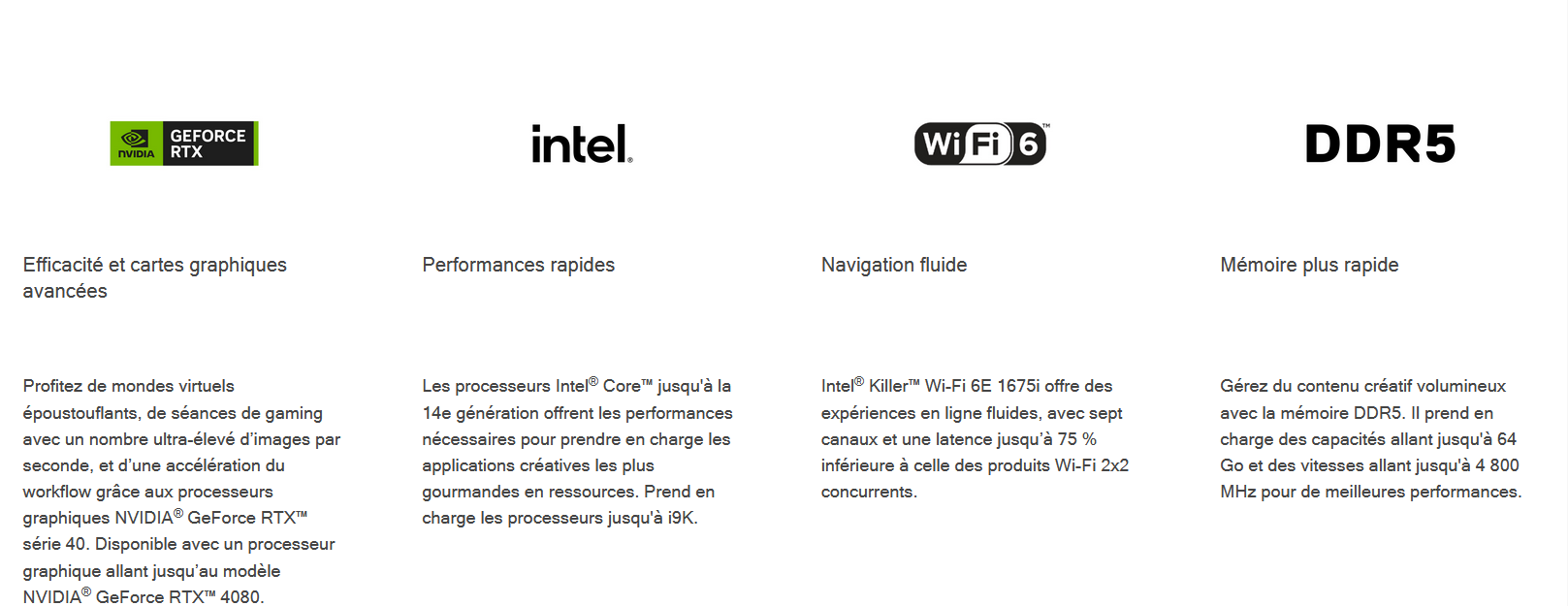 Les processeurs Intel série K 125 W de 13e génération, les cartes graphiques ultrapuissantes allant jusqu’à 450 W et la mémoire DDR5 rapide se combinent pour une expérience de gaming exceptionnelle.